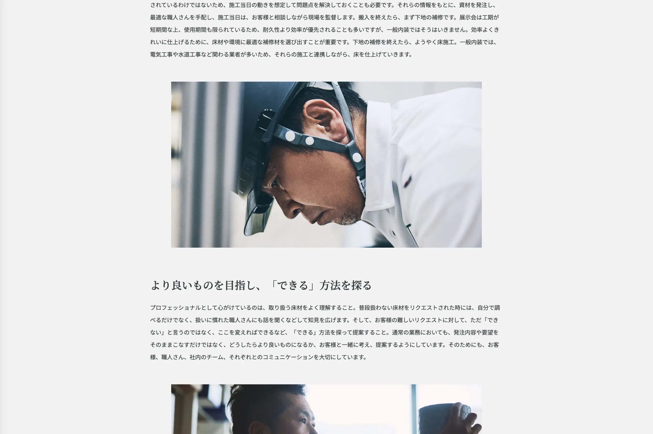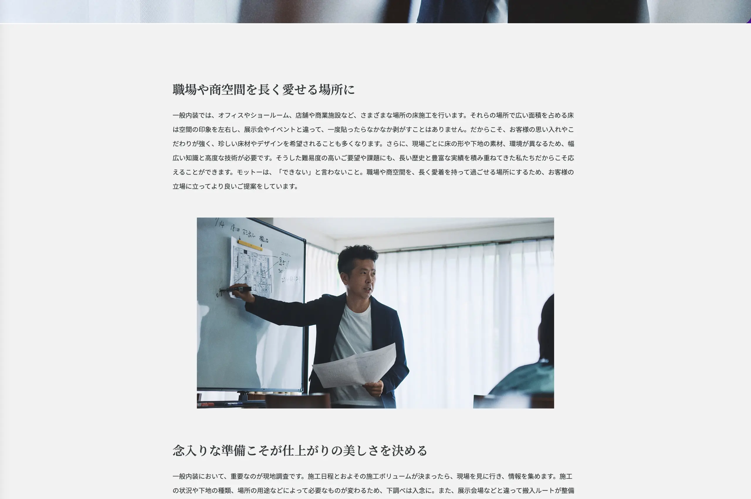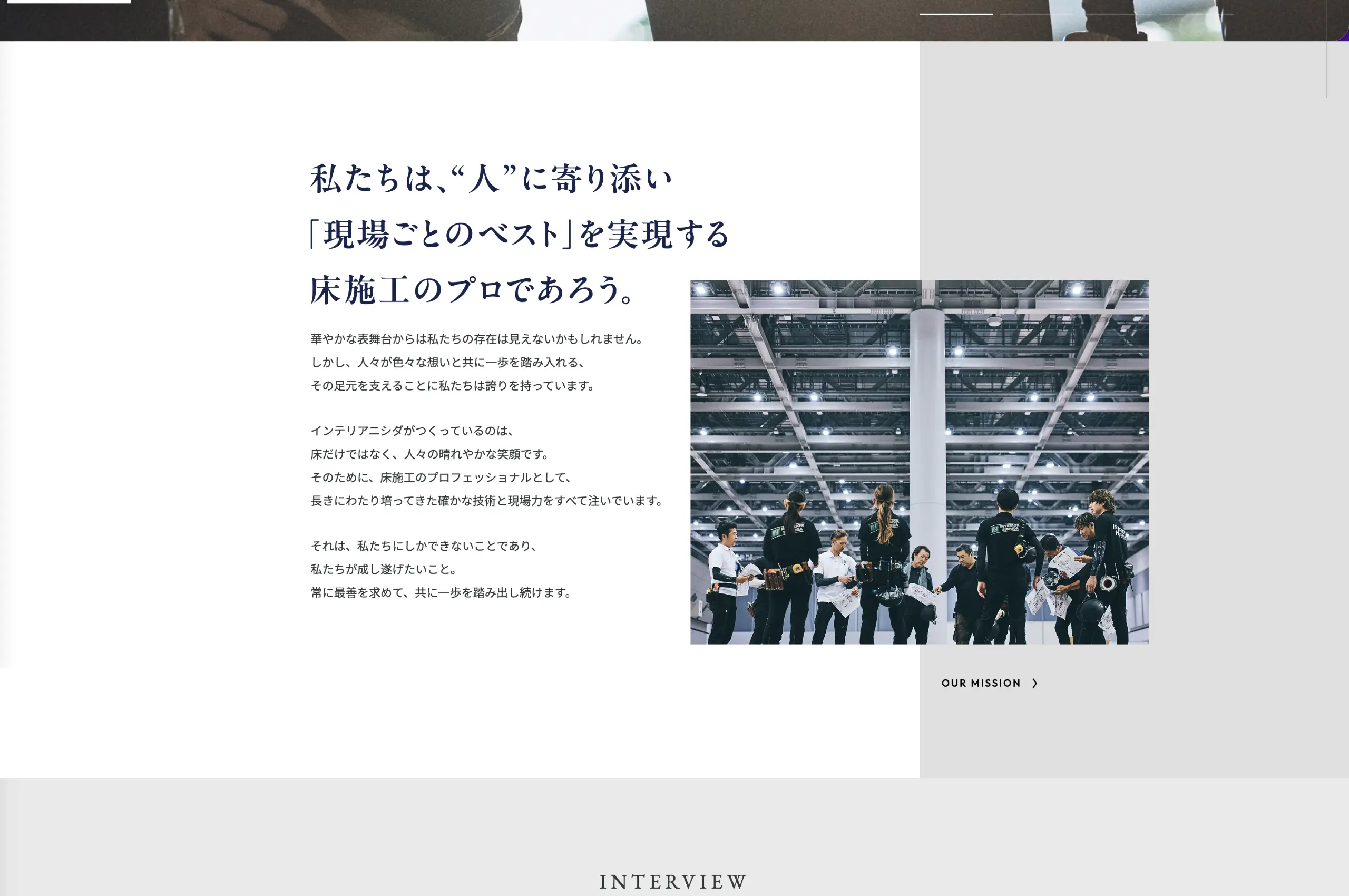 採用難に加え、業界への先入観や不安が応募障壁となっていたため、仕事の価値を正確に伝える企業ブランディングを実施しました。現場社員や社長・会長へのヒアリング/ワークショップを通じて企業の存在価値を再定義し、MISSION・VISION・VALUEを策定。床施工を通じて「訪れる人の笑顔をつくる」使命、現場ごとに最善を尽くす姿勢、チームで完遂する文化を言語化しました。
