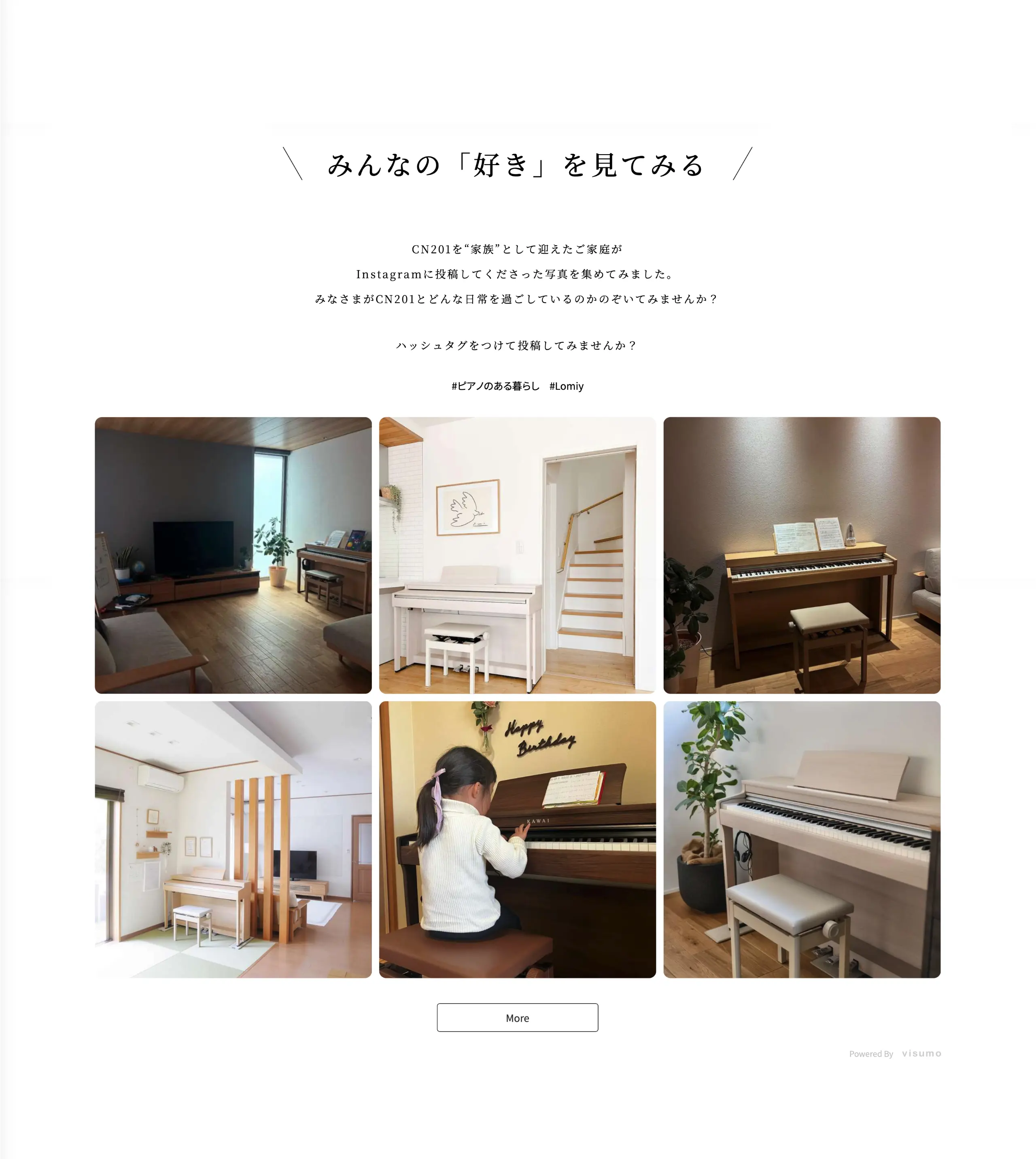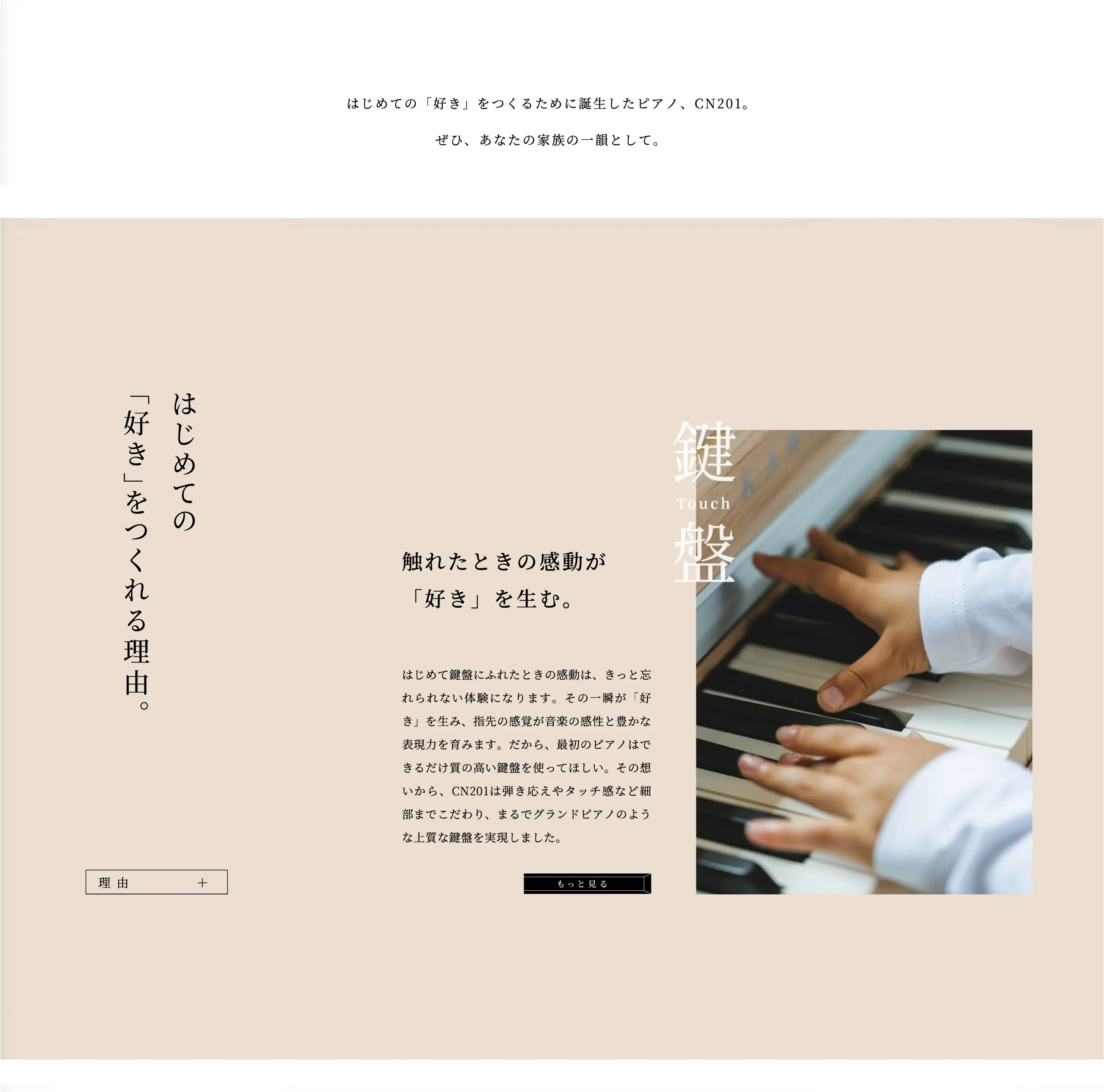 CN201の課題は機能訴求ばかりで競合との差異がないところでした。購入前後の接点で形成される期待と納得の設計として整理し、「ファンづくり」を軸にリブランディングを行いました。言葉・ビジュアル・導線を揃え、迷うことなく購入する動線のコミュニケーション設計を行い、コンセプトの「家族の一韻」タグラインである「はじめての好きをつくるピアノ」を丁寧に描くことで、販売比率44%をわずか3ヶ月で達成しました。
