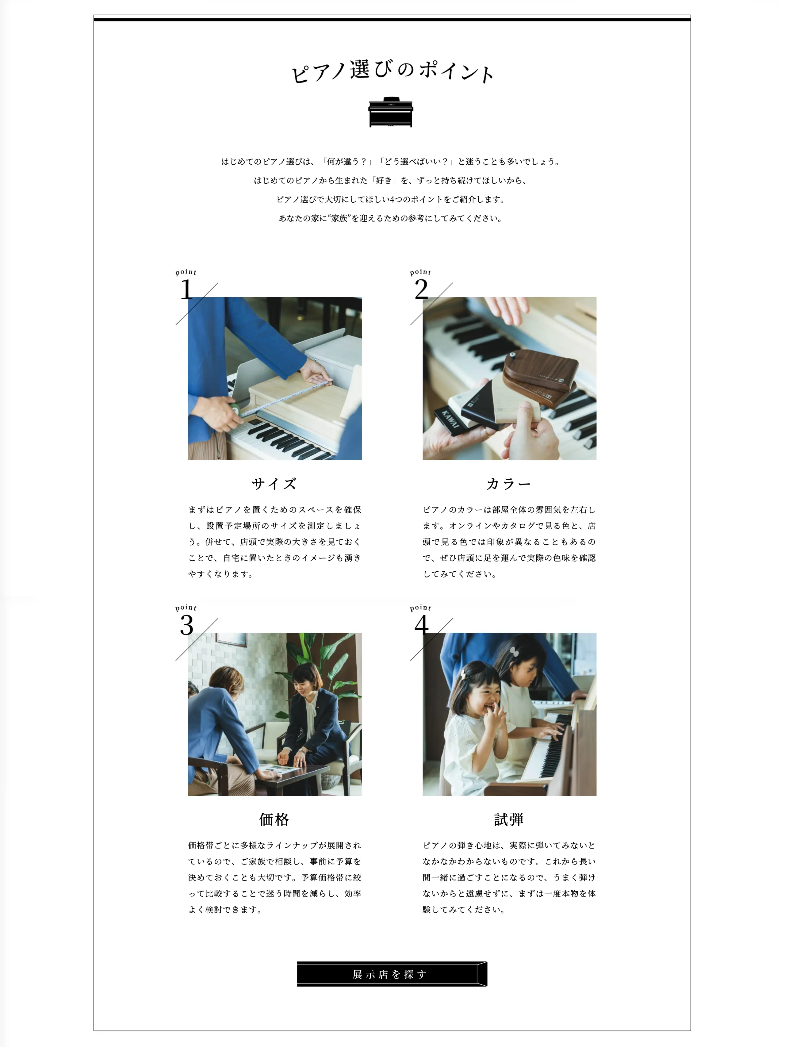 カワイCN201のブランド戦略から制作までの統合設計を行いました。機能比較に寄りがちな状況を踏まえ、情緒価値と検討導線を両立させるため、三姉妹の実話を核に「ファンづくり」をコミュニティ設計として実装。WEB・冊子・店頭の接点を同一ロジックで整理し、短期の成果と中長期の資産化を両立する構造を組み立てました。